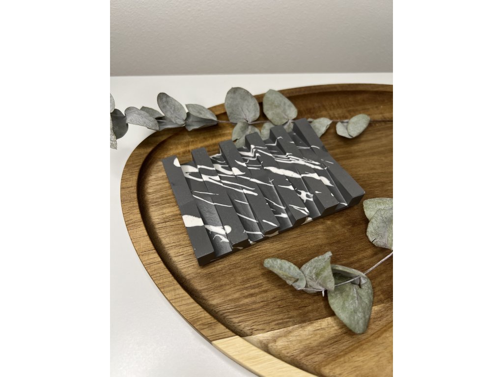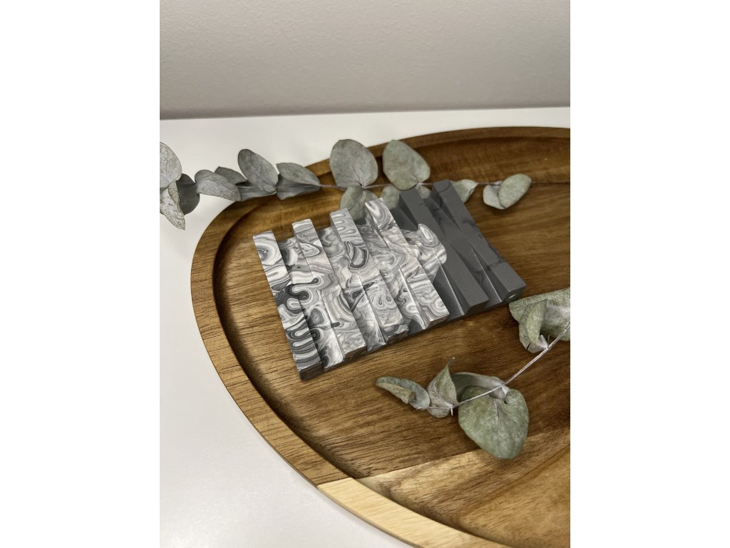 - Použitý materiál: hmota Jesmonite, pigmenty, akrylový tmelící zátěr, tlumící čočky